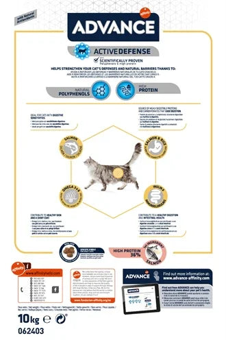 Advance Cat Adult Sensitive Lachs 10 kg ist ein schmackhaftes, vollwertiges und spezielles Katzenfutter für Katzen mit empfindlichem Magen oder Hautproblemen. Katzen mit Magenproblemen haben häufig Verdauungs- und Hautprobleme. Dieses Futter spaltet Protein aus einer leicht verdaulichen Proteinquelle (Lachs) auf, was zusammen mit Reis eine gesunde Verdauung unterstützt. Omega 3 & 6 tragen außerdem zu einem gesunden und glänzenden Fell bei. Die Kroketten sind zudem sehr schmackhaft und werden daher gut angenommen! Ein vollwertiges Futter speziell für erwachsene Katzen.