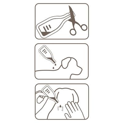 Eine Pipette öffnen, ggf. abstellen, Fell im Nacken mit beiden Händen scheiteln und den gesamten Inhalt direkt auf die Haut auftragen. Nicht verreiben. Hund nicht baden, bis die Lösung getrocknet ist.