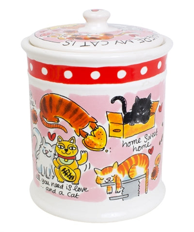 Die Blond Amsterdam Vorratsdose Katze 16X16X22,5 cm ist eine Steingutdose im Blond-Stil zur Aufbewahrung von Trockenfutter oder Leckereien Ihres Haustieres. Diese süße Vorratsdose bringt sofort Farbe ins Zimmer! Die Steingutdose ist im bekannten Blond Amsterdam-Stil gefertigt und mit einem fröhlichen Aufdruck verschiedener Katzen und süßen Texten versehen. Die Vorratsdose ist weiß mit rosa Hintergrund und rotem Band. Auch der Deckel ist mit einem süßen Aufdruck versehen. Die Vorratsdose ist mikrowellen- und spülmaschinenfest und sollte in keinem Haustierhaushalt fehlen!