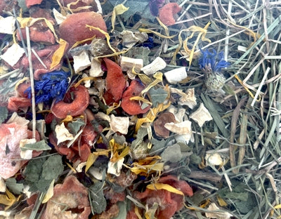 Zusammensetzung: Heu, Karotten, Petersilienwurzel, Zichorienwurzel, Sellerie, Hagebuttenschalen, Birkenblätter, Blumenkohlblüten, Ringelblumenblüten, Johannisbeerblätter, Echte Primel, Rosenblüten (Gemüse 2,6%, Blüten 0,2%, Blätter 0,2%)