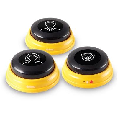 Dieses Set enthält drei sprachaktivierte Tasten, mit denen Sie wichtige Namen oder Wörter aufzeichnen können, z. B. den Namen eines Familienmitglieds, eine Lieblingsspielzeit oder eine Aktivität. Mit den mitgelieferten Symbolaufklebern können Sie die Tasten eindeutig beschriften. Sie erhalten außerdem eine Anleitung vom Gründer mit Tipps zur effektiven Einführung und zum Training der Tasten.
