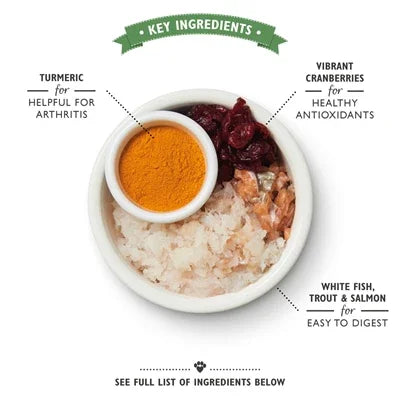 Zusammensetzung : 70 % frisch zubereitete Zutaten: saisonaler Weißfisch (35 %), Truthahn (29 %), Forelle (6 %). Kartoffeln, Kartoffeleiweiß, Zellulose, Fischsauce, Eier, Leinsamen, Grünlippmuschelextrakt (0,2 %), Kurkuma.