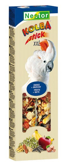 Kolba ziarnowa XXL jest polecana szczególnie dla dużych papug. To nie tylko wspaniały pełnowartościowy pokarm, lecz również doskonała zabawa, nawiązująca do życia w warunkach naturalnych, w poszukiwanie i wyskubywanie przysmaków. Dostarczając rozrywki, kolby pomagają rozładować energię rozpierającą zwierzaki, spędzające przecież na co dzień życie na ograniczonej przestrzeni. Co więcej dzięki drewnianej listewce przyczyniają się do ścierania pazurków i dziobów.