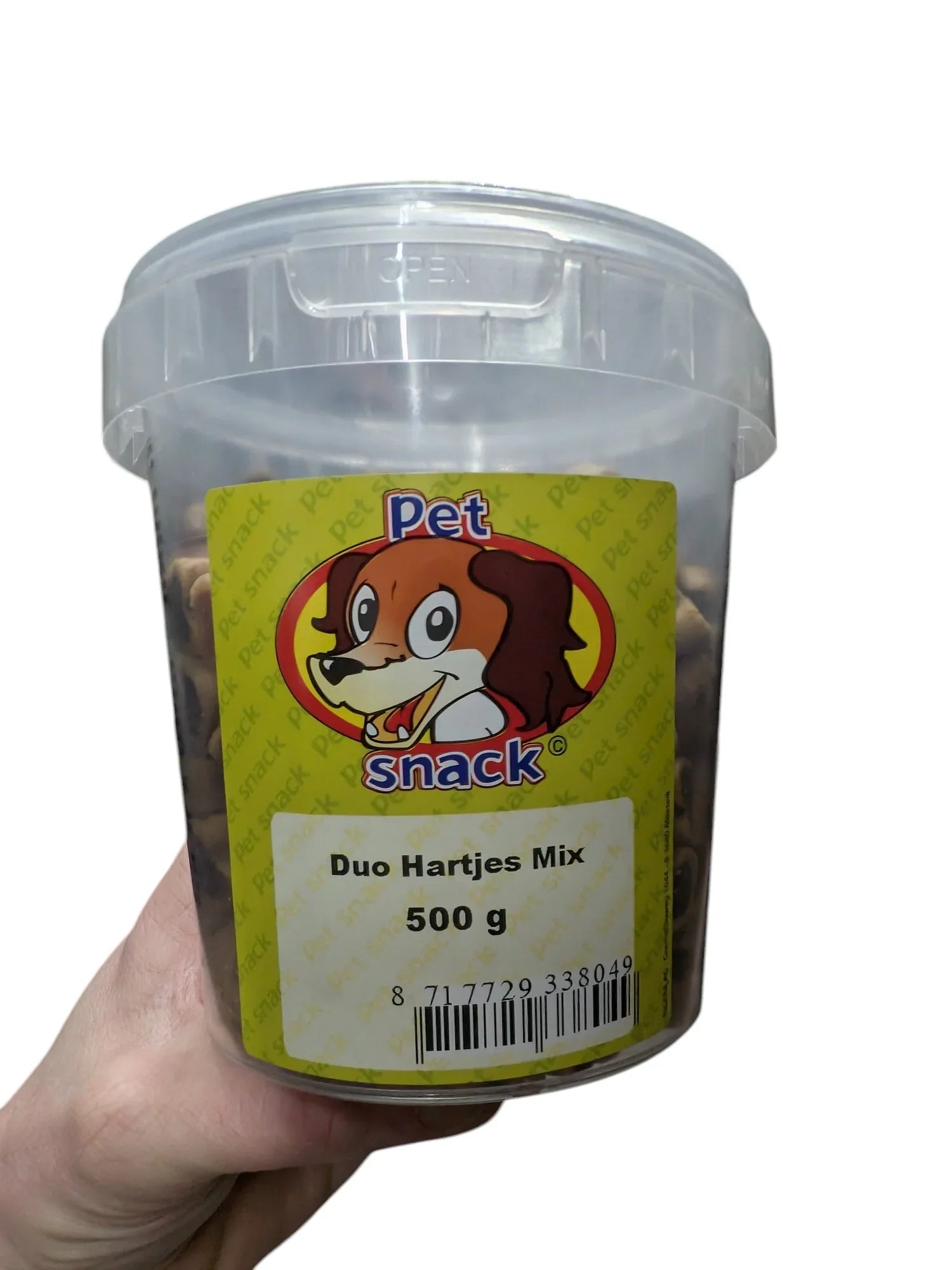 Petsnack Duo Hearts Mix 500g ist ein leckerer Hundesnack, weicher Belohnungssnack für Hunde mit Fleisch und Fisch. Herzen für Ihren Liebling! Probieren Sie diese weichen Bonbonherzen mit leckerer Füllung. Ein wahrer Leckerbissen und ideal als Snack oder Belohnung für Ihren Hund.