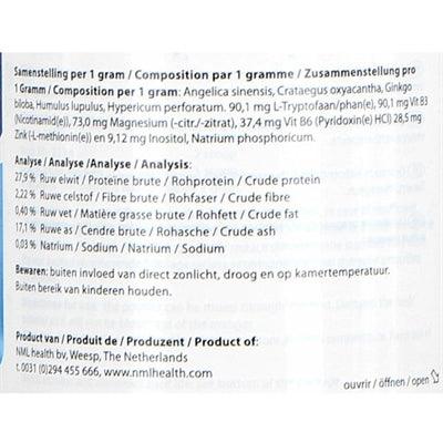 Zusammensetzung: pro 1 Gramm Dong Quai, Hopfen (Humulus lupulus), Ginkgo biloba, Weißdorn (Crataegus oxyacantha), Johanniskraut (Hypericum perforatum), 90,1 mg L-Tryptophan, 90,1 mg Vitamin B3 (Nicotinamid), 73,0 mg Magnesium (als -Citrat), 37,4 mg Vitamin B6 (als Pyridoxinhydrochlorid), 28,5 mg Zink (als -L-Methionin) und 9,12 mg Inositol. Eine Verdünnung von Natrium phosphoricum.