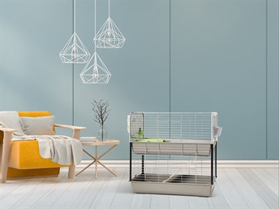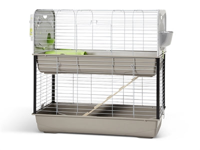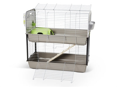 Ein Doppelkäfig für Nagetiere in modernem Design. Die obere Ebene verfügt über zwei Kunststoffseitenteile mit integrierten Futternäpfen, Wasserflaschen und Heu-/Gemüseständern. Eine Holzleiter verbindet die obere und untere Ebene. Der Käfig bietet außerdem eine Plattform und einen Unterschlupf in einem. Der untere Käfig verfügt über eine große Tür für einfachen Zugang zum unteren Bereich. Der obere Käfig hat eine kleine Tür vorne und eine größere Tür oben für einen einfachen Einstieg. Der Caesar ist faltbar und somit leicht zu transportieren.
