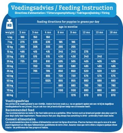 Um Verdauungsproblemen vorzubeugen, führen Sie das Futter schrittweise über einen Zeitraum von 7 Tagen ein. Stellen Sie sicher, dass Ihr Welpe immer Zugang zu frischem Trinkwasser hat. Lagern Sie das Futter kühl und trocken.