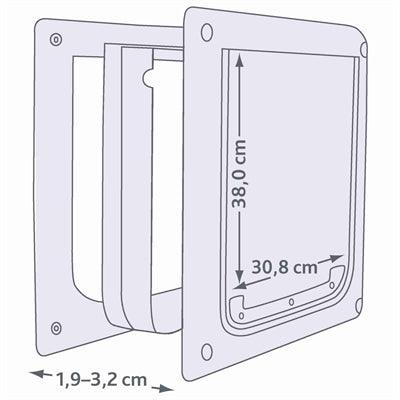 Die Trixie 2-Wege-Hundeklappe Weiß M-XL 39 x 45 cm ist eine Kunststoff-Haustierklappe für Hunde mit flexibler, geräuschloser Klappe und Verriegelungsmechanismus. Ideal, um Ihren Hunden die Freiheit zu geben, nach Belieben ein- und auszugehen! Diese Klappe verfügt über eine flexible, transparente Klappe, die leise schließt. Die abnehmbare Metallplatte ermöglicht das Verschließen und schützt Ihr Zuhause vor unerwünschten Tieren, Regen und Wind. Inklusive Tunnelelement mit einer Einbautiefe von 19–32 mm.