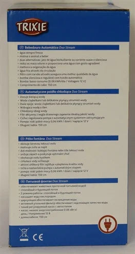 Der Trixie Duo Stream Trinkbrunnen versorgt Ihren Hund oder Ihre Katze stets mit frischem, sauerstoffreichem Wasser. Dank zweier Einstellungen können Sie je nach Vorliebe Ihres Tieres zwischen einem sprudelnden Strahl oder einem sanften Sprühnebel wählen. Die Wasserzirkulation trägt zur natürlichen Abkühlung bei und animiert Ihre Tiere zum Trinken. Der Aktivkohlefilter verbessert die Wasserqualität, indem er Geschmacksstoffe und Verunreinigungen reduziert. Die Pumpe verfügt über eine Auto-Stopp-Funktion für zusätzlichen Komfort. Der Trinkbrunnen besteht aus Kunststoff und ist energieeffizient. Ersatzfilter sind separat erhältlich.
