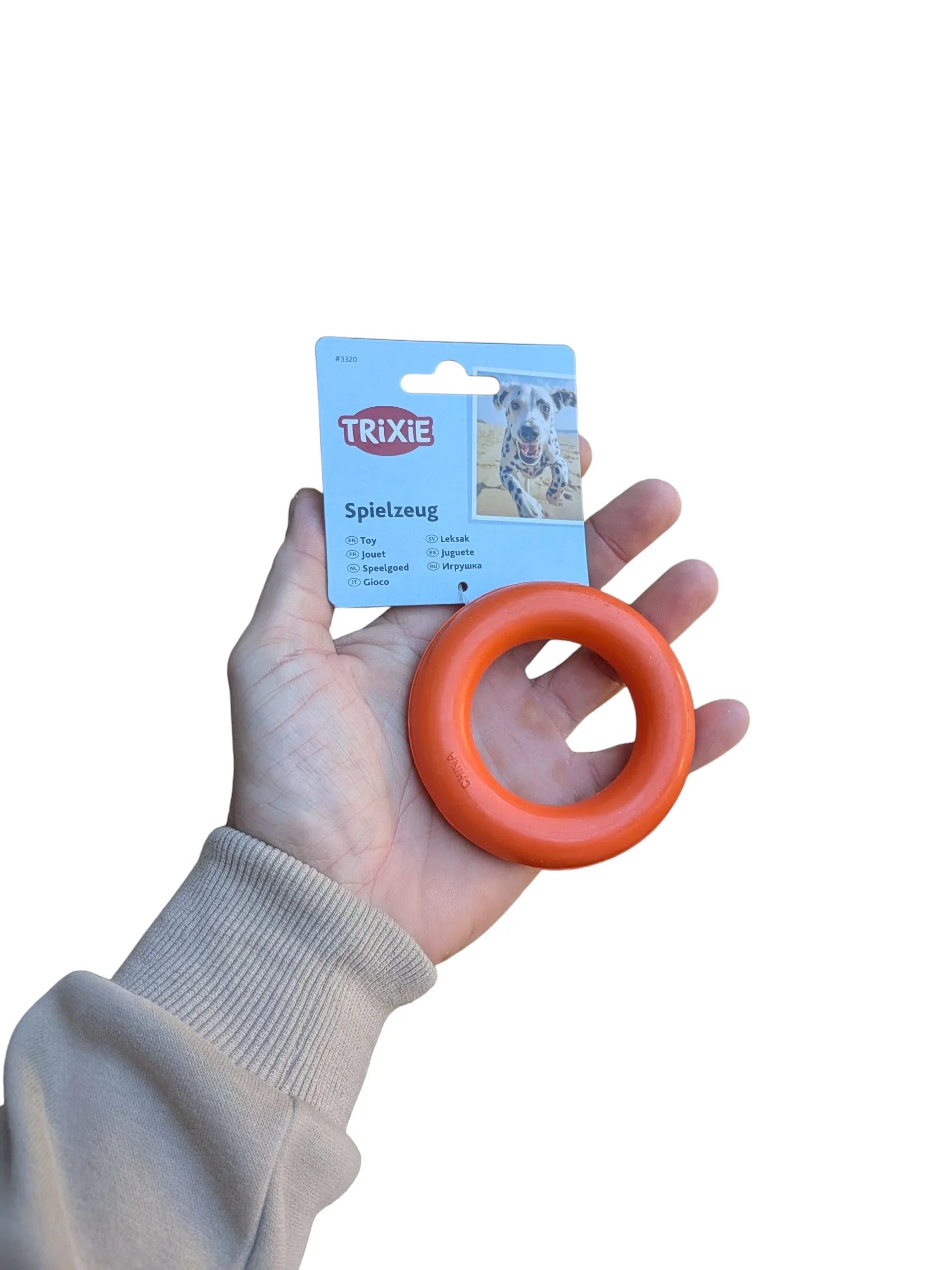 Der Trixie Ring aus Naturkautschuk ist in zwei Größen erhältlich:
