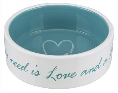 Füllen Sie diesen Futternapf mit Futter und Ihr Haustier wird es gierig verschlingen. Der petrolfarbene Schriftzug auf dem Napf lautet: „All you need is love and a pet.“