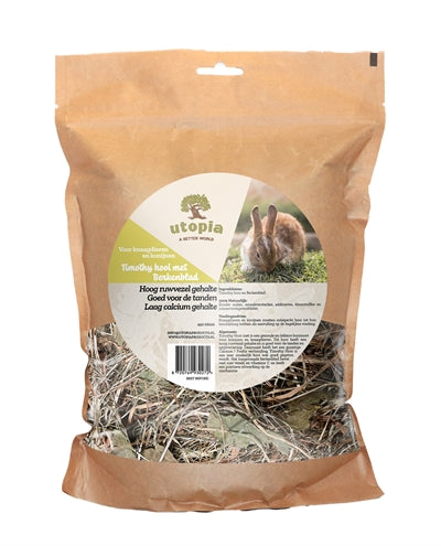 Utopia Timothy Heu mit Birkenblättern 450 g ist ein Ergänzungsfuttermittel für Kaninchen und Nagetiere mit hohem Rohfasergehalt. Timothy Heu ist ein gesundes und schmackhaftes Heu für Kaninchen und Nagetiere. Dieses Heu hat einen hohen Rohfasergehalt und ist gut für Zähne und Verdauung. Es hat außerdem ein günstiges Kalzium-Phosphor-Verhältnis. Timothy Heu ist ein sehr schmackhaftes Heu, das gerne verzehrt wird. Das zugesetzte Birkenblatt enthält viel Rohfaser und Vitamin C. Es wirkt sich außerdem positiv auf die Nierenfunktion aus. Dieses Heu ist 100 % natürlich und frei von Zucker, Geschmacksverstärkern, Zusatzstoffen, Farbstoffen und Konservierungsmitteln.